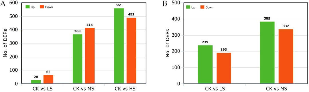 Figure 1. Identification of the differential expressive proteins (DEPs). A) DEPs in LYP9 (Salt-tolerant) under various salt stress levels as compared with the control plants. B) DEPs in NPBA (Salt-susceptible) under various salt stress levels as compared with the control plants. CK: control, LS: low salt, MS: medium salt, HS: high salt.