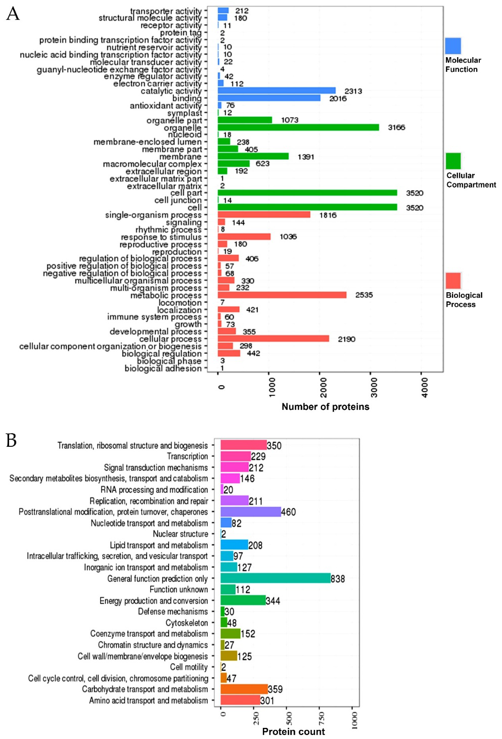 Figure 2. GO and COG analysis of the differentially responsive proteins in response to salt stress. A) The distribution of number of differentially responsive proteins alongside their corresponding GO terms. Different colors represent different GO categories. B) The distribution of number of differentially responsive proteins alongside their different functions as annotated by COG analysis.