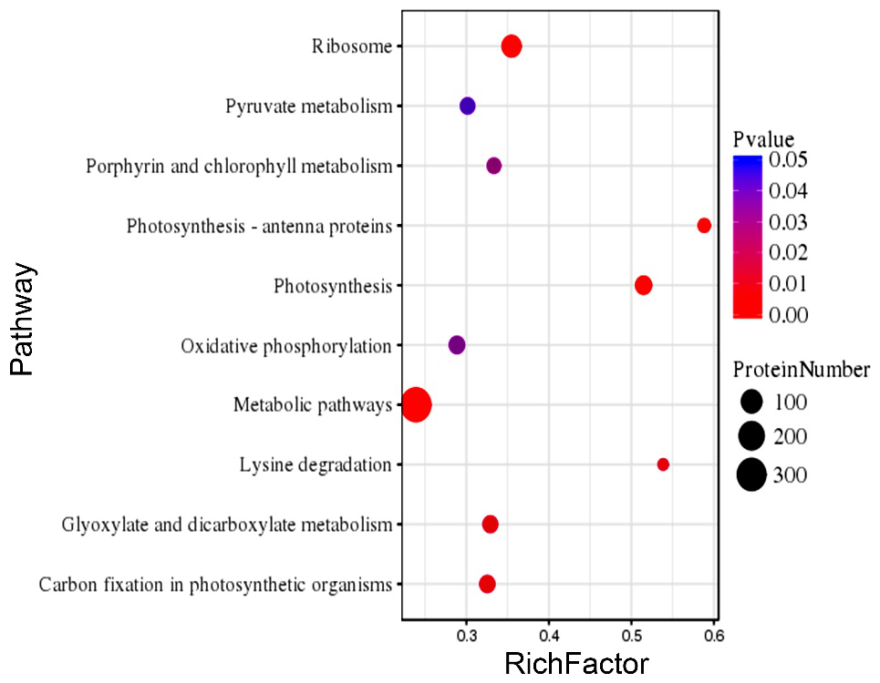 Figure 3. Top 10 pathway enrichments of the identified DEPs in LYP9 (Salt-tolerant) and NPBA (Salt-susceptible) by KEGG analysis. The corresponding pathways are listed on the Y-axis and the Rich factor values are mentioned along X-axis. Different sized dots represent the distribution of DEPs for a corresponding pathway, whereas, their color represents the P value.