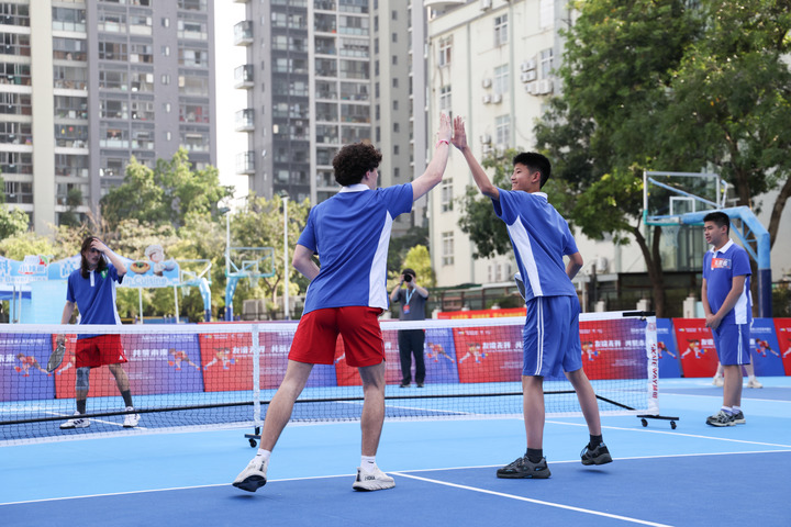 4月15日,在深圳市南山外国语学校(集团)高新中学,中美学生结对进行匹克球双打比赛。(新华社记者 梁旭/摄)