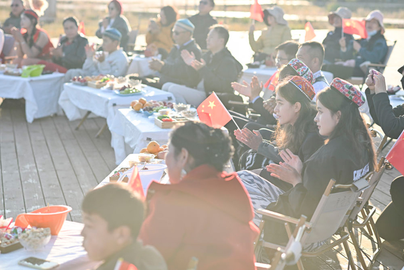 江苏泰州援疆干部人才与昭苏农牧民家庭代表齐聚,观看节目(2025年10月6日摄)。(新华社记者 胡虎虎/摄)