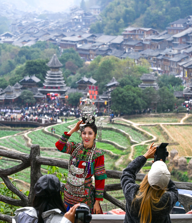 游客在贵州省黎平县肇兴侗寨观景台留影(2025年12月20日摄)。(新华社记者 杨文斌/摄)