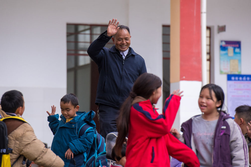 2025年2月18日,在落松地小学,农加贵(中)下课后和学生挥手告别。(新华社记者 彭奕凯/摄)