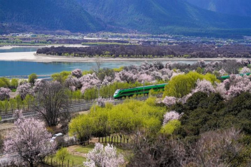 2025年4月2日,复兴号列车穿行在拉林铁路林芝段。(新华社记者 晋美多吉/摄)