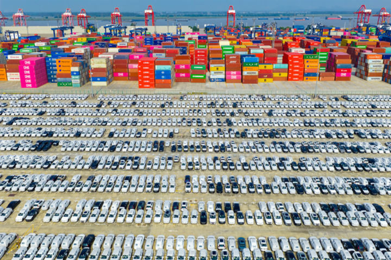 2025年10月4日在江苏省港口集团南京港龙潭港区拍摄的准备装船出口的汽车(无人机照片)。(新华社发 杨素平/摄)
