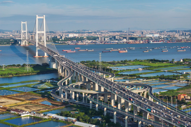 2024年10月2日,广东南沙大桥上的车流和狮子洋水道的船舶来来往往(无人机照片)。(新华社记者 刘大伟/摄)