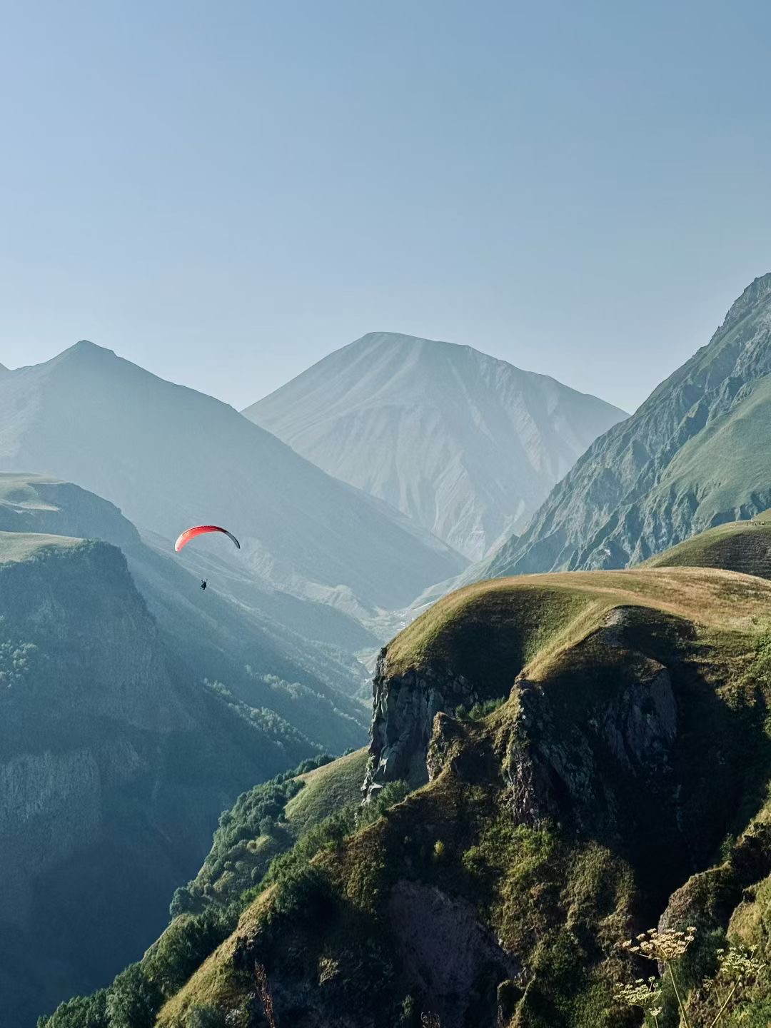 《山峦峡谷间,一抹红翼滑翔,群峰叠翠,风与自由共舞》